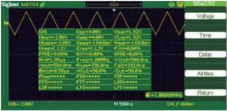 Функция автоматического измерения 32 типа автоматических измерений, 3 типа курсорных измерений, может одновременно отображать на экране все измеряемые параметры; множество курсорных измерений отвечают требованиям измерения |