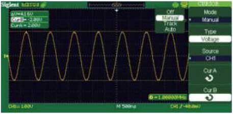 Измерение вручную Включение измерения времени и напряжения. Во время измерения времени и напряжения расстояние между двумя курсорами может регулироваться вручную. |