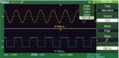 Попеременная синхронизация Чтобы стабилизировать два сигнала с разной частотой, для каждого канала можно выбрать разный тип синхронизации, как будто в цифровом осциллографе встроен аналоговый осциллограф. |