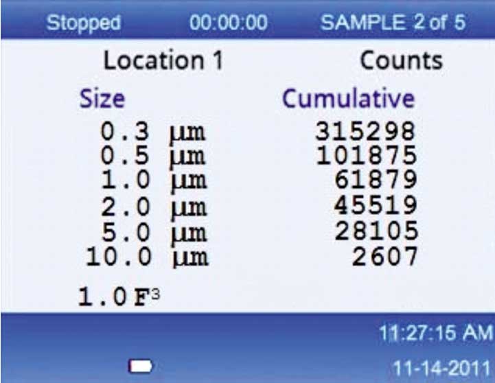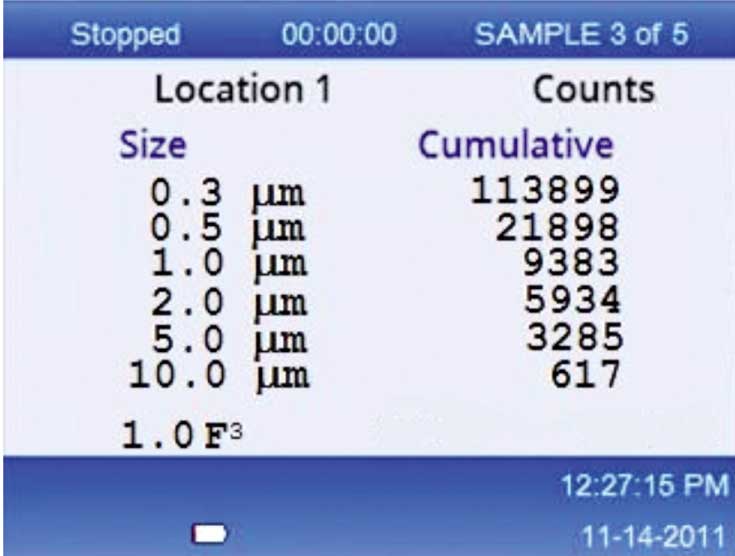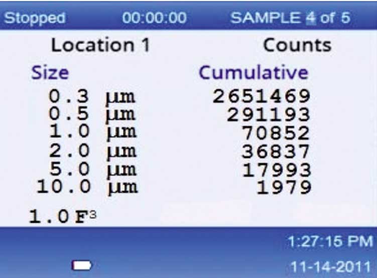 Получаемое в результате среднее значение для всех местоположений находится в пределах требований для чистого помещения класса Class 5. Прибор Fluke 985 выдаёт данные о взвешенных частицах по 6 каналам на одном дисплее, что позволяет специалисту охватить все показания одним взглядом. Хотя упражнение для чистого помещения было сфокусировано на частицах размером 0,3 мкм, единый дисплей немедленно сообщил бы специалисту о превышении концентрации в любой другой категории частиц. Специалист может настраивать число каналов для различных размеров частиц, выводимых прибором Fluke 985, и устанавливать оповещение звуком или подсветкой текста для превышения концентраций тех размеров частиц, которые представляют интерес. После сертификации чистого помещения специалист может осуществлять мониторинг концентрации частиц за заданный им период при помощи функции графика трендов прибора Fluke 985. Её можно использовать на стадии чистого помещения "в работе". Это позволяет специалисту осуществлять мониторинг производственного процесса при необычном увеличении концентрации частиц и обнаруживать события, приводящие к загрязнениям. Эта функция также позволяет специалистам просматривать тренды сразу же на приборе до экспорта данных, что экономит огромное количество времени. С помощью подставки USB/Ethernet для Fluke 985 специалист может быстро переносить данные на компьютер через USB или по сети для немедленного анализа и быстрого принятия мер. Функция задержки прибора Fluke 985 полезна для определения концентрации части для чистого помещения "в покое", когда все люди покинули чистое помещение, система вентиляции профильтровала воздух и среда стабилизировалась.