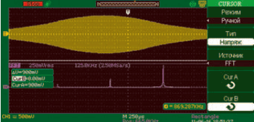 Некоторые изменения в новых моделях цифровых осциллографах SDS-1хх2CM, SDS-1xx2CFL и SDS-1xx4CFL по сравнению с другими моделями осциллографов произошли и в работе приборов при анализе спектров на основе быстрого преобразования Фурье (БПФ). Добавилась такая важная возможность, как курсорные измерения результата БПФ причем, курсорные измерения можно проводить как в частотной (рис. 9), так и в амплитудной области (рис. 10).