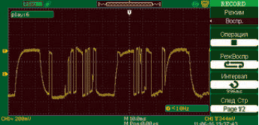 Значительно расширены возможности покадрового регистратора. В моделях осциллографов SDS-1хх2CM, SDS-1xx2CFL и SDS-1xx4CFL вместо 1000 кадров можно записать до 2500 кадров. Покадровый регистратор может быть использован в задачах автоматической регистрации коротких сигналов с длительным интервалом между ними. Регистратор может записывать кадры через заданный промежуток времени, а затем воспроизводить их. Кратко проиллюстрируем данную функцию в новых моделях осциллографов (рис. 13-15). Например, на рисунке 13 показан сигнал в начале записи, его вид через 3,5 с показан на рисунке 14. Используя режим воспроизведения можно видеть переход — на рисунке 15 показан 6-й кадр.
