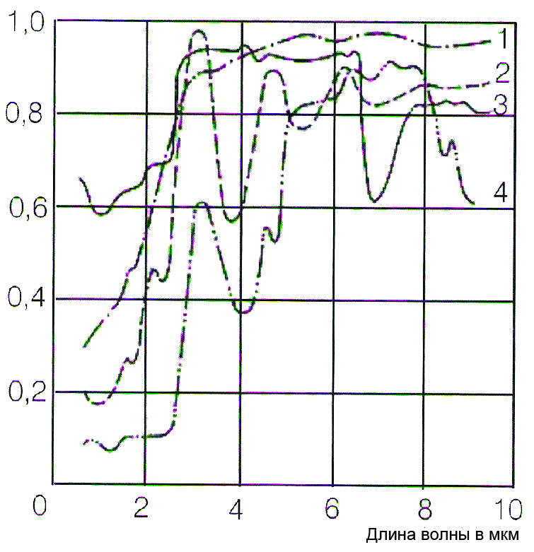 Спектральный коэффициент излучения некоторых материалов 1. Эмаль, 2. Штукатурка, 3. Бетон, 4. Шамот |
