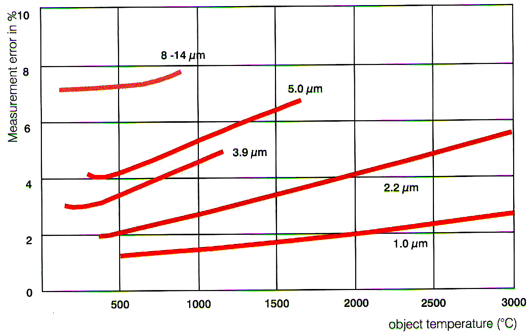 Оптимальный диапазон длин волны для металлов составляет 0,8…1,0мкм для высоких температур, когда излучение металлов попадает в видимую область спектра. Помимо этого, допускается использование длин волн 1,6мкм, 2,2мкм и 3,9мкм. |
