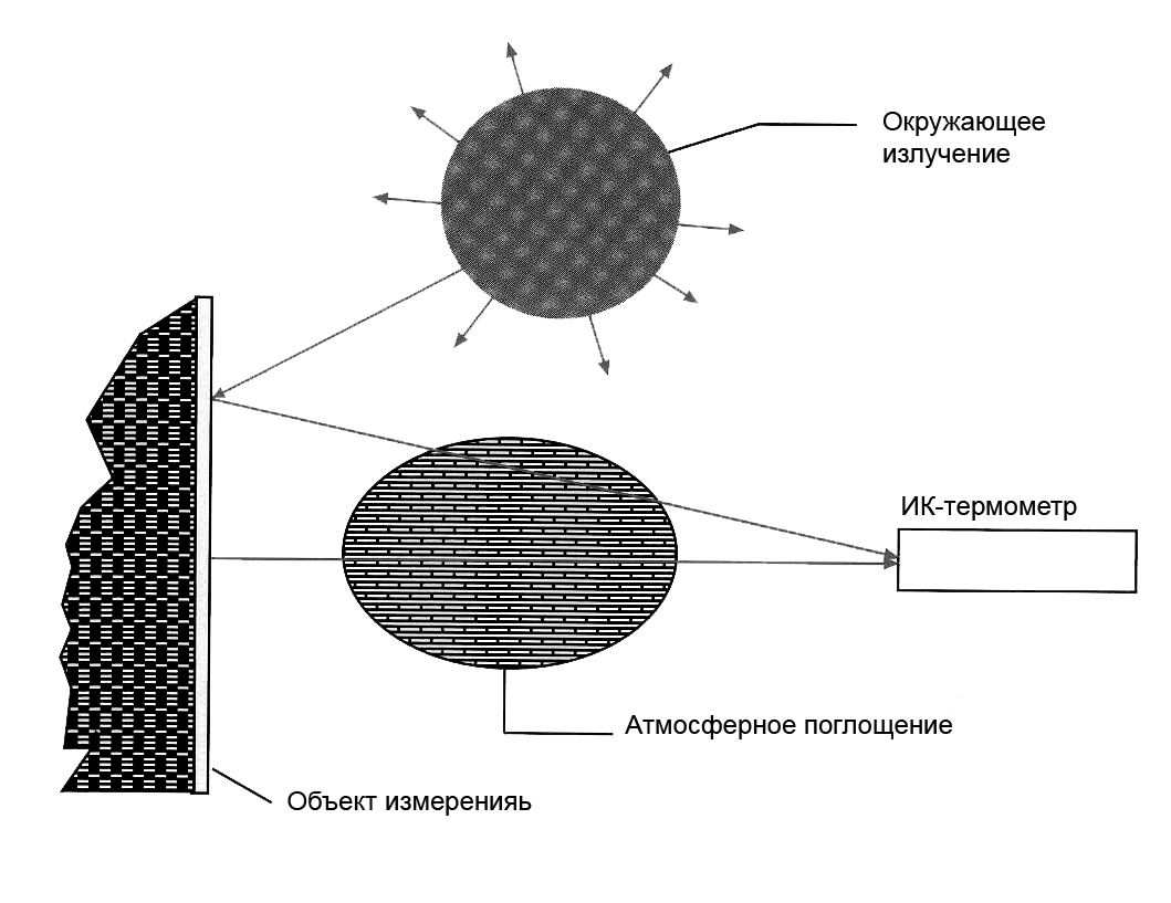 Дополнительно на измерения могут влиять источники тепла вокруг измеряемого объекта. Чтобы избежать получения неправильных результатов измерения из-за повышенной температуры окружающей среды, инфракрасный термометр изначально выполняет компенсацию такого влияния. (Например, при измерении температуры металлов в промышленных печах, где стенки печи имеют температуру выше, чем у измеряемого объекта.) Второй датчик температуры помогает получать точные результаты измерения, автоматически компенсируя температуру окружающей среды и правильно настраивая коэффициент излучения .